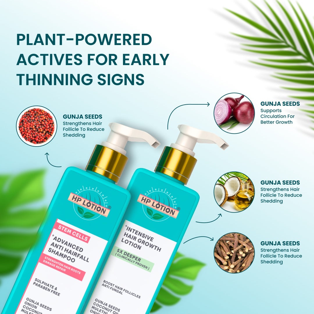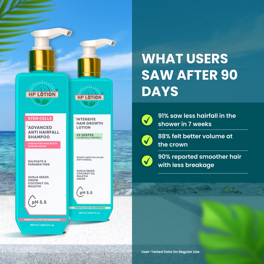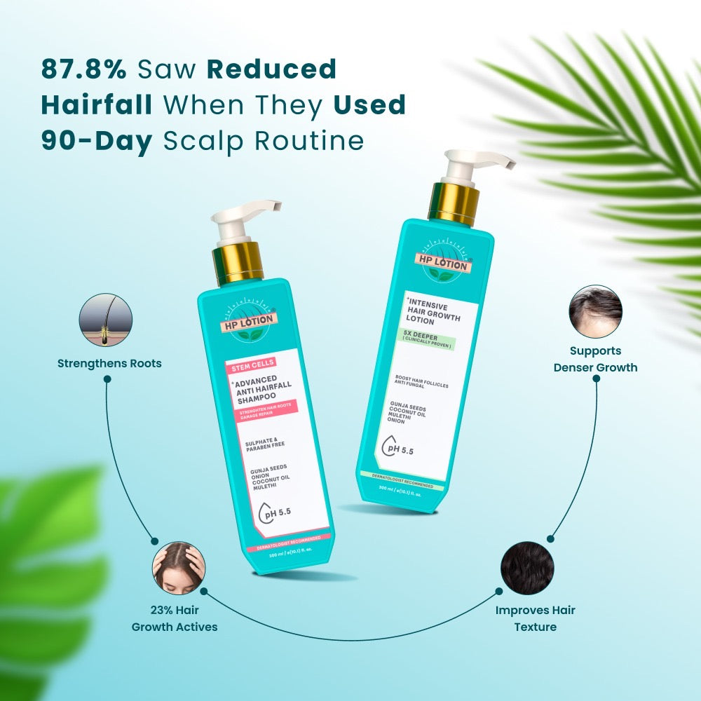 This power-packed combo combines the deeply nourishing HP Lotion Intensive Hair Growth Lotion by stimulating hair growth, reduces hair fall, and nourishes the scalp for a healthier hair growth with the strengthening Stem Cells Advanced Anti-Hair Fall Shampoo Enriched with stem cells, the "food" for hair follicles, it promotes new growth and extends the hair growth cycle to give you the hair you've always dreamed of.