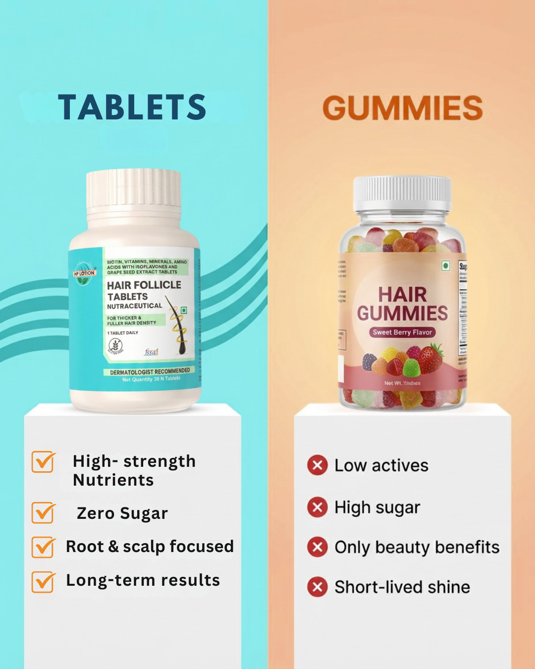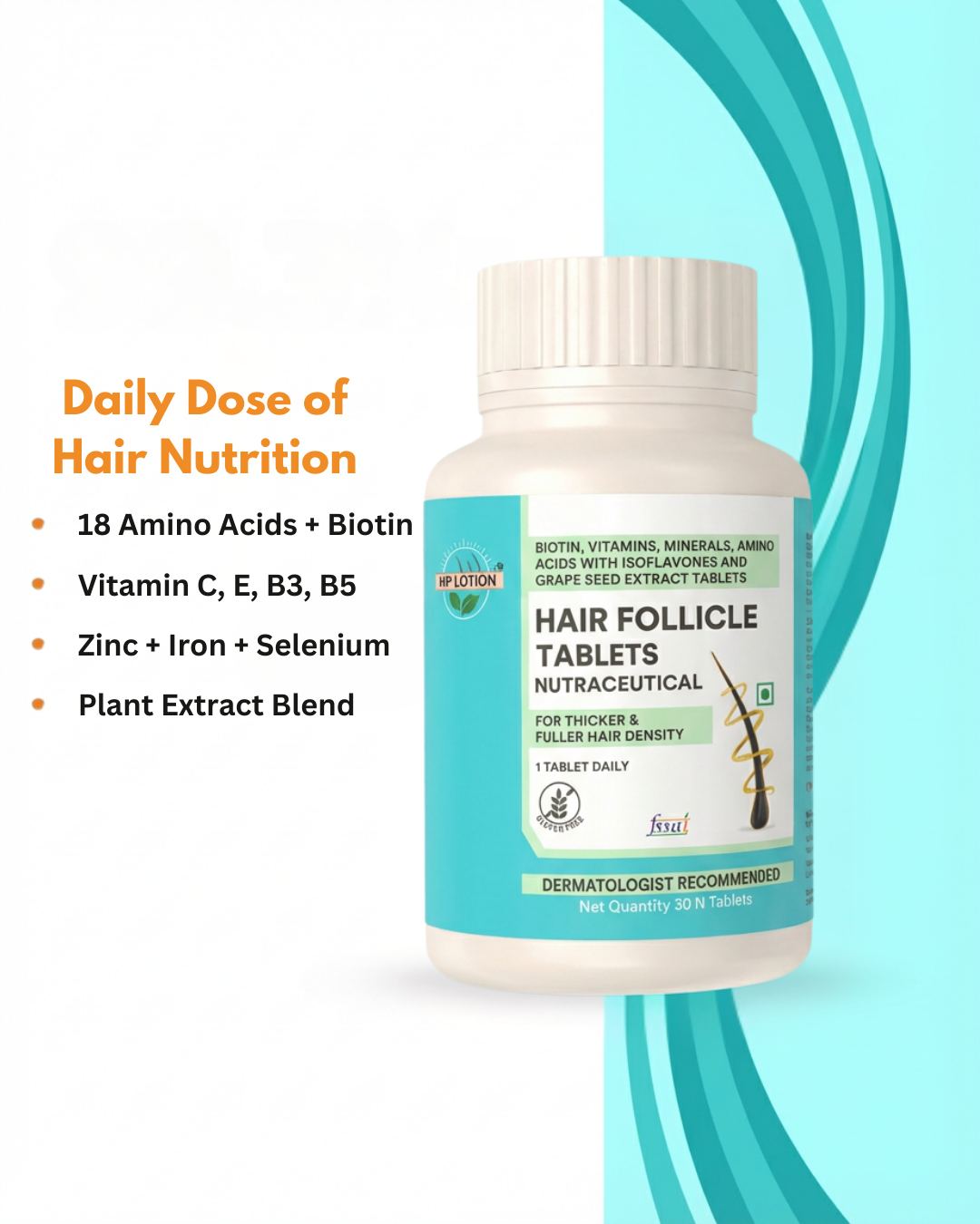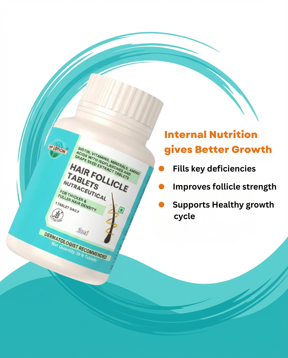 Our follicle tablets (Gluten Free) true potential is to increase hair growth by up to 95.4%. This nutrition is made by combining all energy & protein-based nutrients, which act as the building blocks for hair and help reduce premature shedding & breakage internally. Up to 100% Protection of delicate/weak follicles affected due to daily stress.